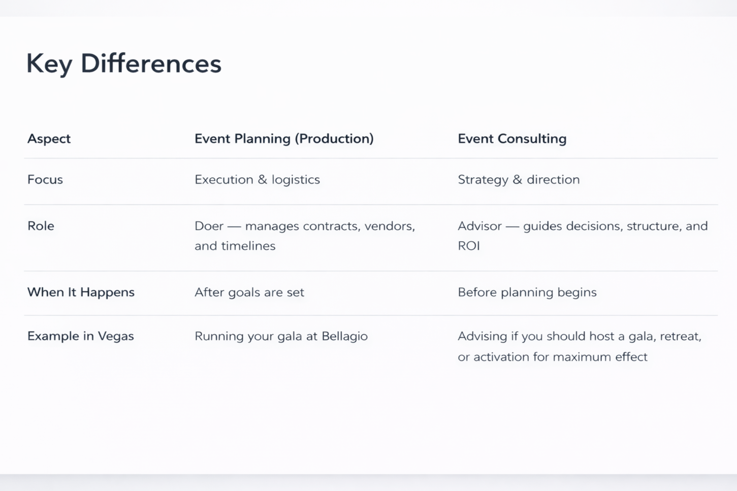 In a city like Las Vegas, where events are bigger, bolder, and more competitive than anywhere else, it’s essential to know who you need on your side. Two roles that often get confused are event planning (or production) and event consulting. While they may sound similar, they serve very different purposes—and knowing the difference can be the key to creating an event that’s not just well-executed, but strategically unforgettable.
